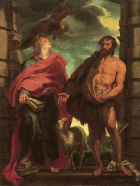 | Saint John the Evangelist and Saint John the Baptist in a niche, an extensive landscape beyond | |
