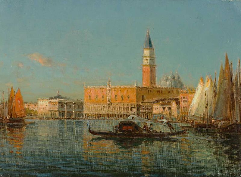 Blick über Boote auf den abendlich beleuchteten Dogenpalast.