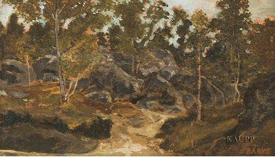 | La forêt de Fontainebleau. Waldlandschaft mit schlanken Bäumen und grauen Felsbrocken. | |