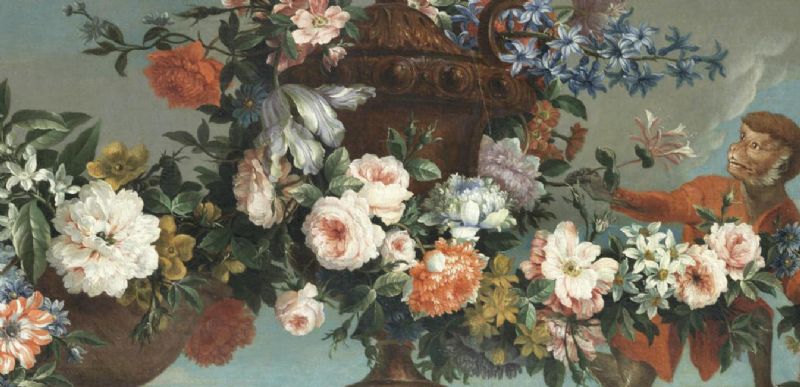| Hyacinthes, roses, chrysanthemums and narcissi in a terracotta vase on a stone ledge, with a monkey | |