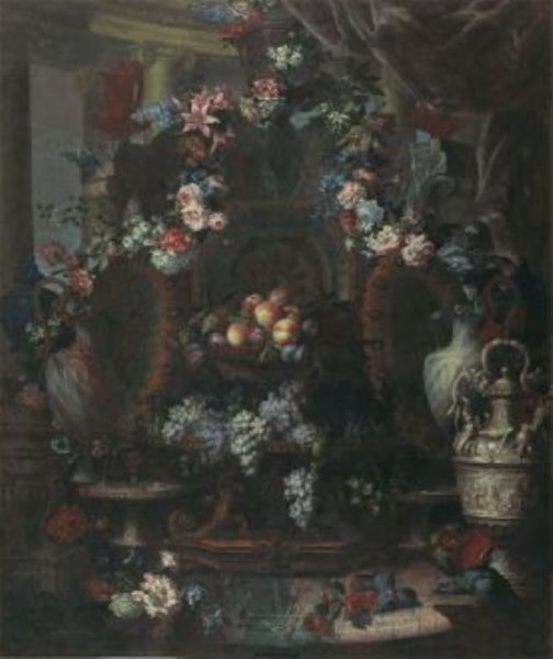 | Nature morte de pièces d'orfèvreries, plats de raisin et pêches, guirlandes de fleurs | |