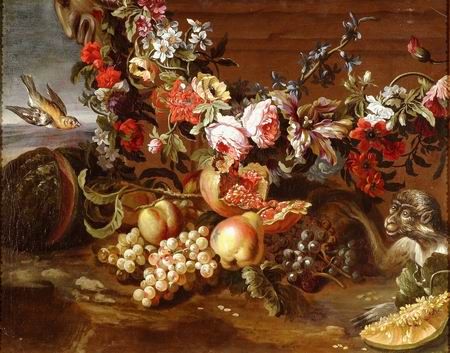 NATURE MORTE A LA GUIRLANDE DE FLEURS, MELON ET