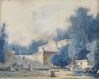 | Demeure dans un parc, des promeneurs au premier plan | |