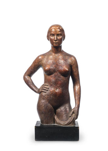 A bronze female nude, with her right hand on her hip, on a black marble plinth base