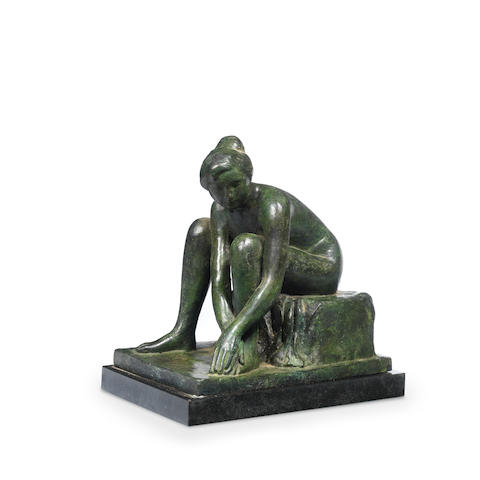 | A bronze figure group of a woman bathing, modelled sat leaning forward, touching her left foot | |