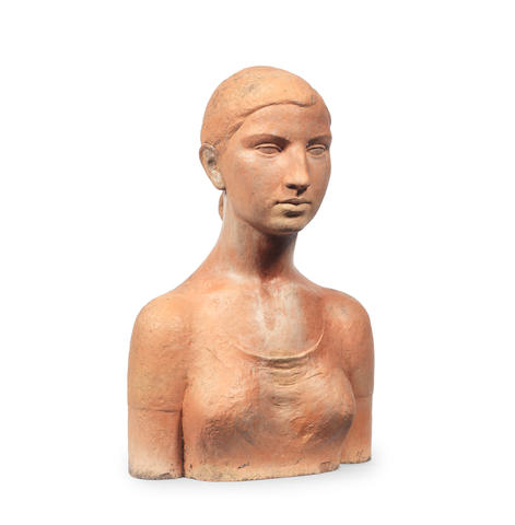 | A terracotta bust of a young woman, her hair tied back and wearing a dress | |