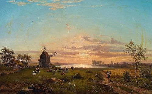 ABENDLICHE FLUSSLANDSCHAFT MIT MÜHLE