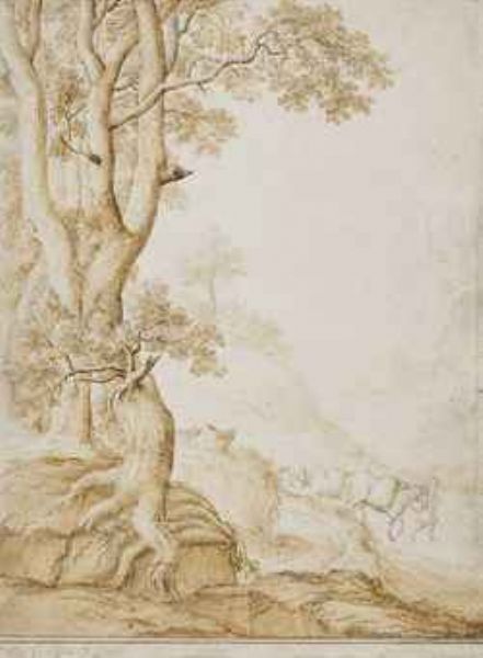 Paysage arboré, un homme et ses chevaux à l'arrière-plan