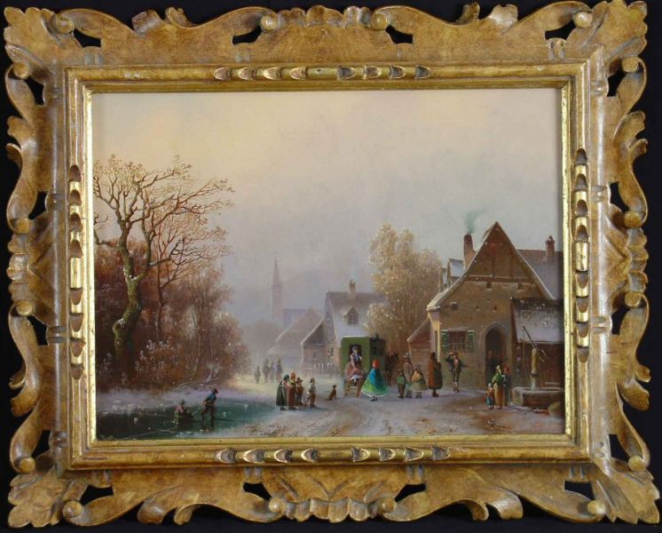 Dorfszene mit ankommenden Reisenden im Winter