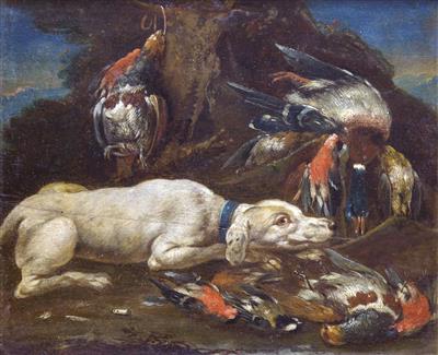 Umkreis Jagdhund vor erlegtem Federvieh in Landschaft