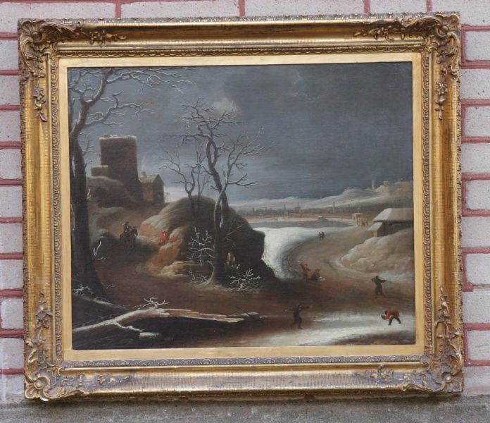 Uppfodrad på ny duk, vinterlandskap med figurer och stadsvy