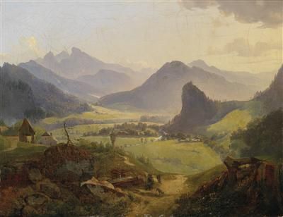 | View of a mountainous landscape (Schafberg in Upper Austria?) and human and animal figures in the foreground | |