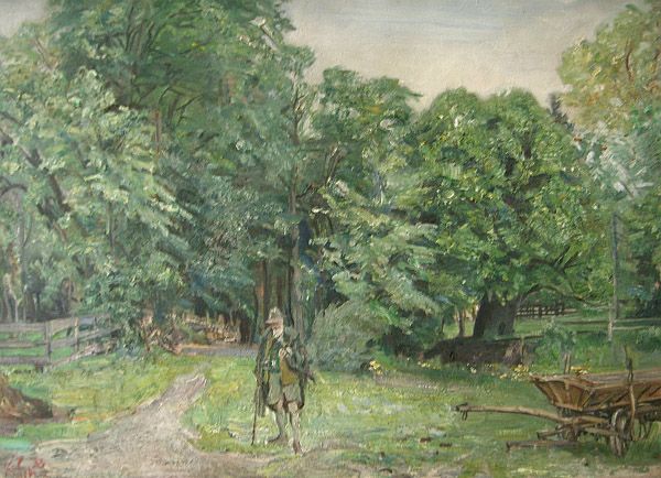| Jäger am Waldrand mit frischem Grün der Bäume und den Wiesen sowie der Blick zum heiteren Himmel. | |