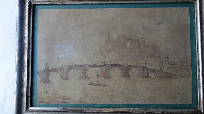 | Bridge over river, in the background city gate, houses and a castle | |