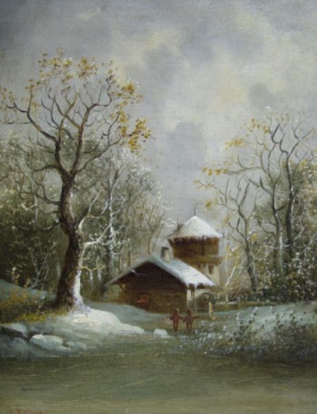 Figures by a frozen pond with a mill and woodland
