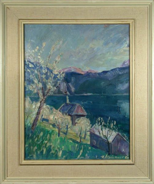 | Frühlingspartie an einem See, im Vordergrund eine kleine Kapelle mit einem Küsterhäuschen, umgeben von blühenden Wiesen und Obst | |