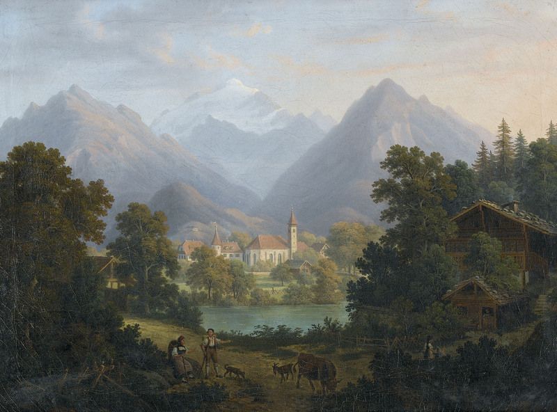 Idyllische Landschaft mit Bergkulisse und Dorf. Interlaken mit Schloss....?