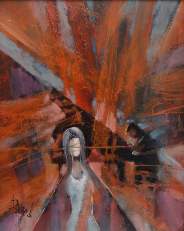 Dvě postavy v abstraktním prostoru
