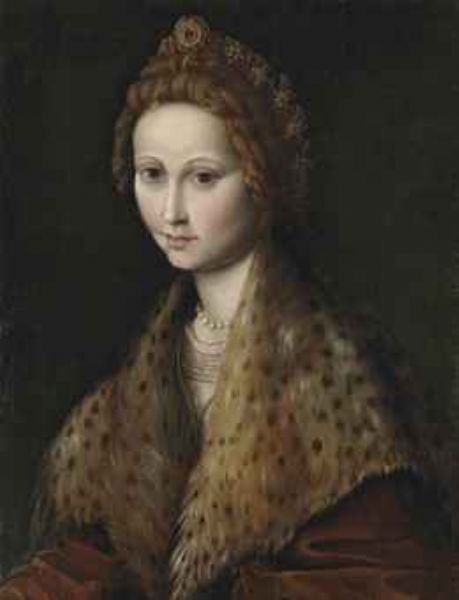 | Portrait of a lady, half-length, in a red coat with a leopard-fur mantle, pearls and jewels in her hair | |