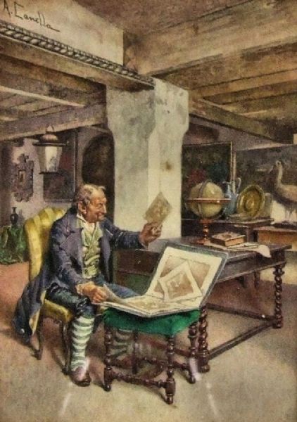 | Interior scene with an elderly man looking through a folio of prints, an interior scene with an elderly man reading a book, and | |