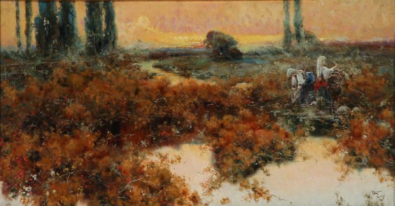 | Two women washing clothes at a stream near Rome. Signed A. Reyna Roma | |