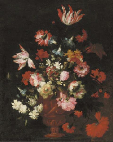 | Tulips, roses, morning glory and other flowers in a sculpted terracotta vase, on a stone ledge | |