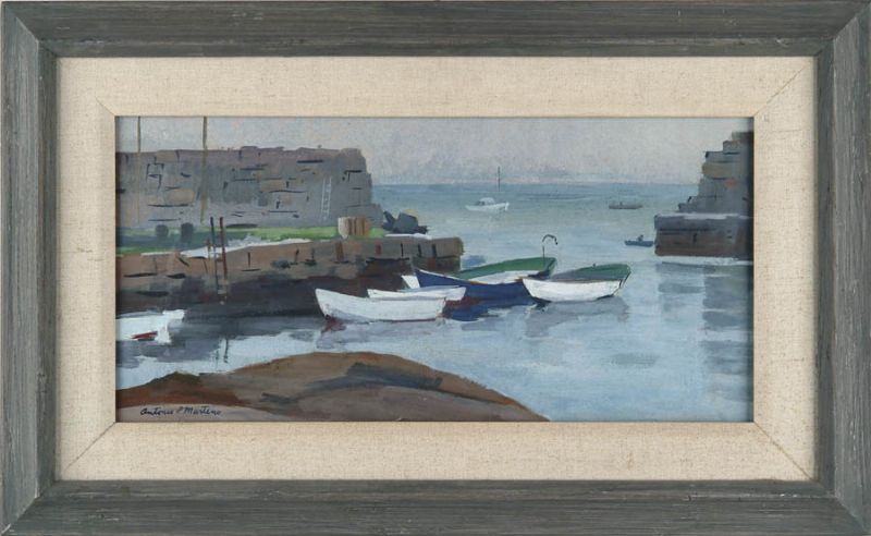 | Oil on board scene shows a granite enclosed small harbor with rowboats moored on calm water. A lobster boat is seen outside of entrance with a figure in a rowboat | |