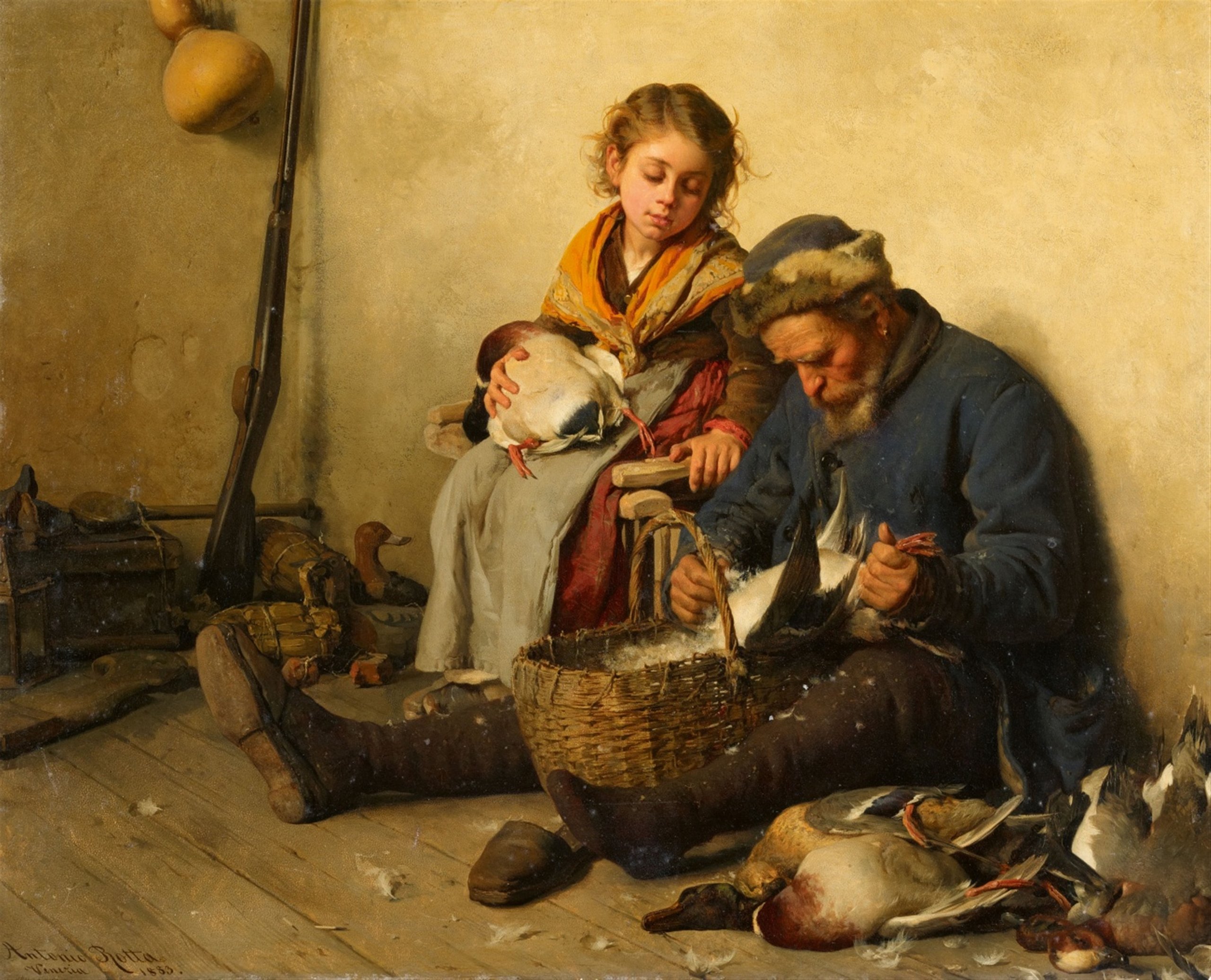 | Interior Scene with a Grandfather and Granddaughter plucking Ducks | |