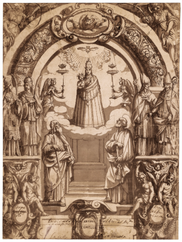 | THE MADONNA OF LORETO, ST. PETER AND ST. PAUL, WITH TWO BISHOPS AND TWO FEMALE SAINTS ON PEDESTALS | |