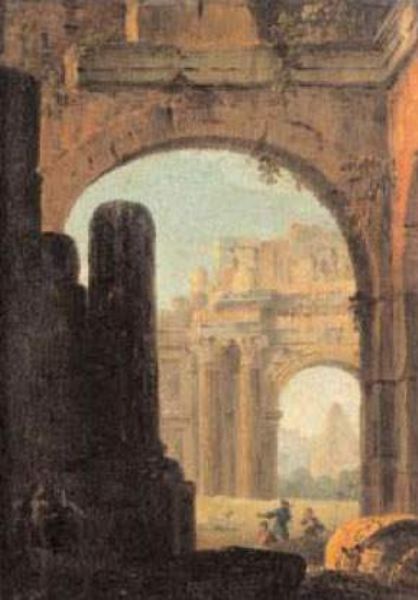 | Ruines antiques avec arc et pyramide animées de promeneurs | |
