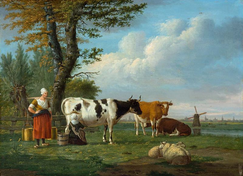 | Hirtinnen mit Weidevieh vor weiter Landschaft mit Windmühle | |
