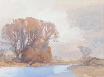 A river landscape with large trees to the foreground