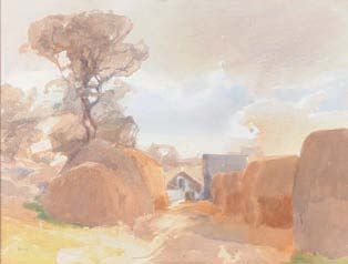Haystacks and farm buildings