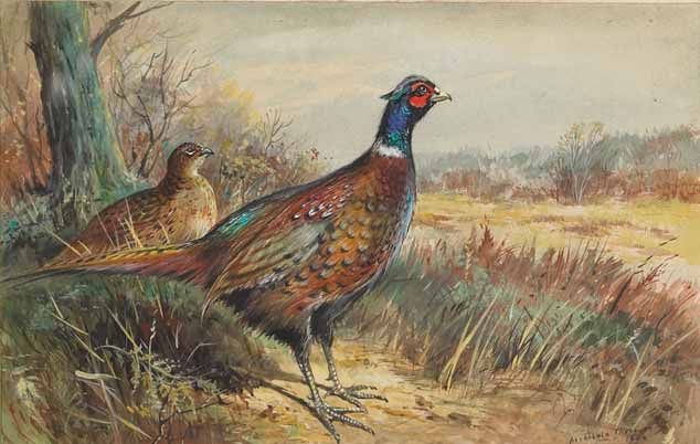 COCK AND HEN PHEASANT IN A WOODLAND CLEARING