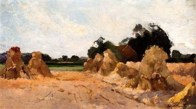 Korenschoven in het veld, Hooimijt bij boerderij, Schuur aan landweg