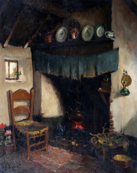 Interieur met brandende haard