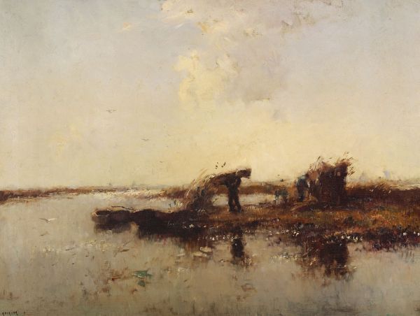 Boeren met rietschoven aan de waterkant