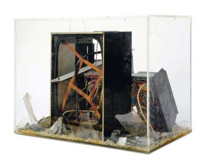 Unknown broken TV in a Plexiglas box