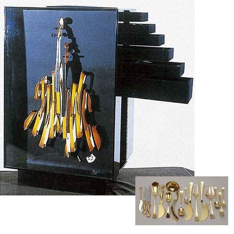| Wood Violon découpé dans une boite en plexiglas contenant 116 pièces d'un service en vermeil | |