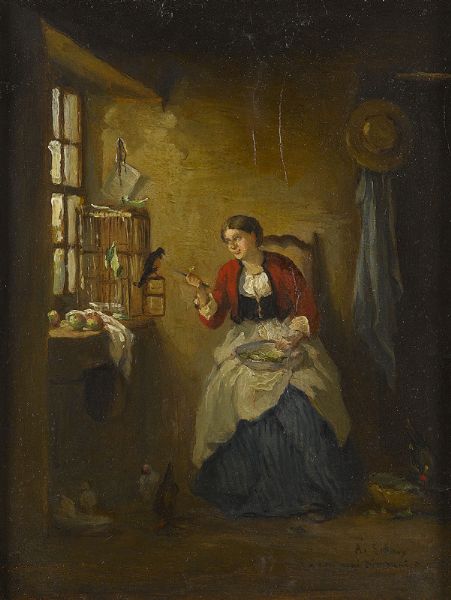 Interieur mit Frau und Vogelkäfig.