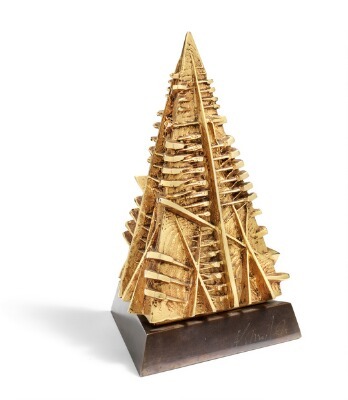 “Piramide” (Pyramid). Signed A. Pomodoro, XIII/C. Gilded bronze on metal base. Total H. 15 cm. | |