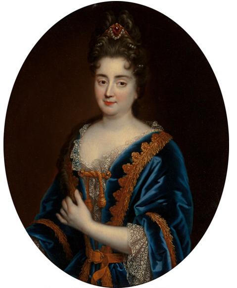 | A portrait of a lady, half-length, wearing a blue dress trimmed with gold and lace | |