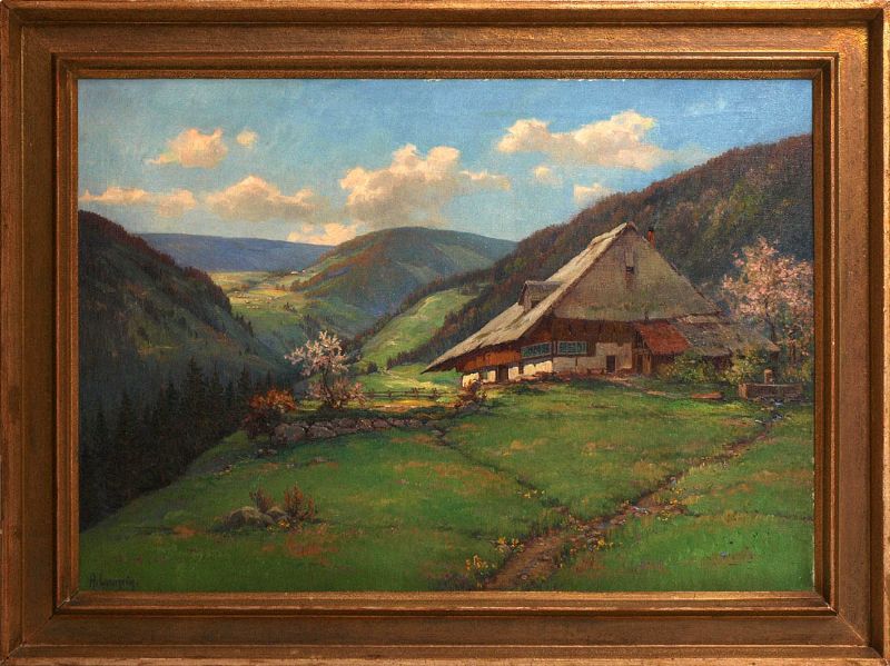 | Blick ein weites, frühsommerlich begrüntes Schwarzwaldtal, im Vordergrund ein Bauerngehöft mit Brunnen und blühenden Obstbäumen | |