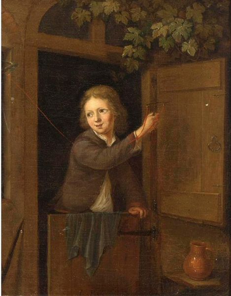 | A FINCH ON A FOWLING-LINE HELD BY A BOY STANDING IN A DOORWAY | |
