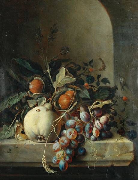 Chestnuts, a pear, grapes and blackberries on a stone ledge before a niche