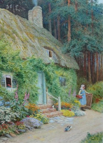 FIGURE BEFORE THATCHED COTTAGE