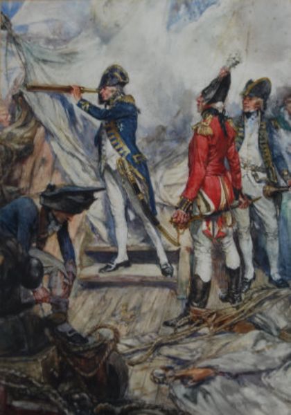 | Admiral Horatio Nelson standing on the gun-deck surveying the enemy through his telescope with officers in attendance and in the | |