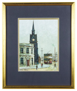 A Northern street scene with trams & a church