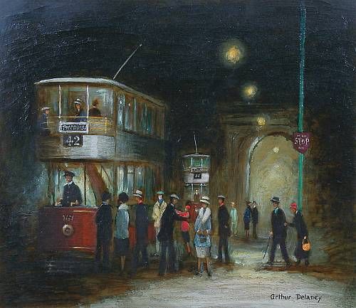 Manchester tram scene at night time, possibly outside the porch of Manchester Town Hall