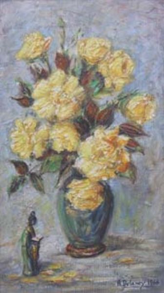 Still life of flowers in vase and figurine